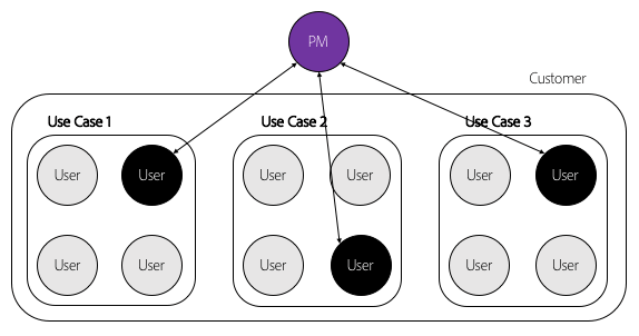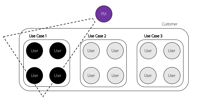 This lack of meaningful customer interactions then leads to confirmation bias. The little time that is available is used to confirm ideas with a few randomly selected customer accounts (typically the ones the product manager has access to) and a specific group of customer representatives within these accounts (see Figure 1), who may belong to the same use case.