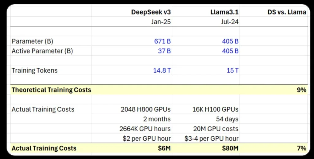 Training cost comparison between DeepSeek V3 and Llama 3.1. DeepSeek, in theory, has no access (if not smuggled) to H100 GPU