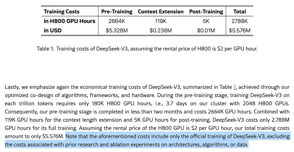 It is also evident in their report that the training cost has excluded costs associated with prior research, ablation experiments on architectures, algorithms, or data.