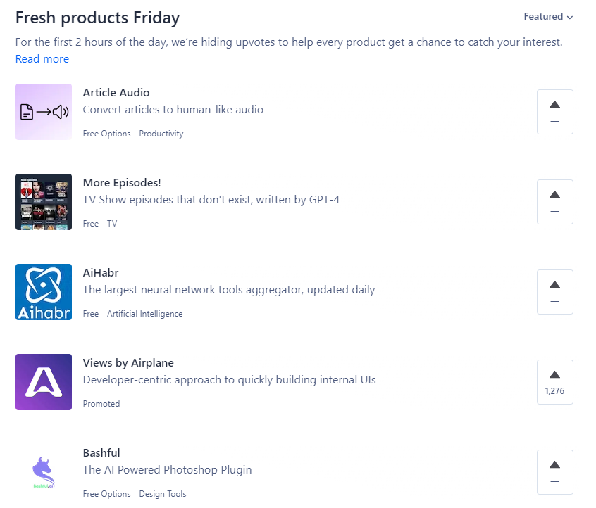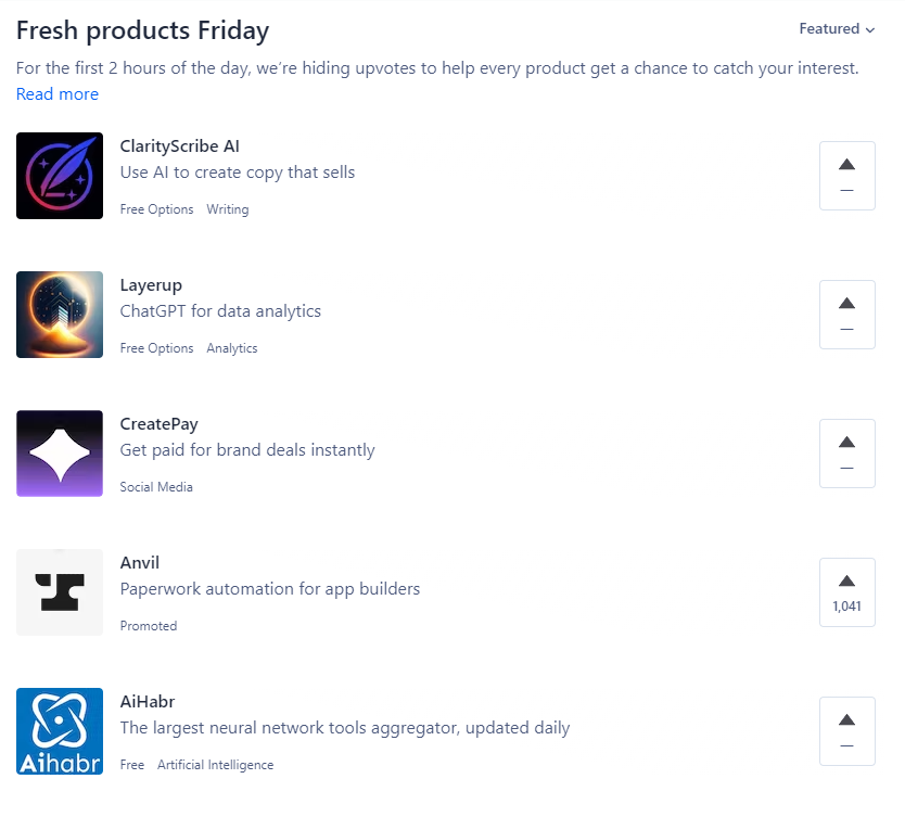 Essentially, during the first two hours of the launch day (00:01–02:00 PST) the leaderboard changes at random, and product upvotes during this period are hidden. At this same time (00:01–02:00 PST) the number of upvotes a product has been visible on the launch page itself, but its overall ranking on the leaderboard remains unknown. As before, the final rating is determined by the community at the end of the day.