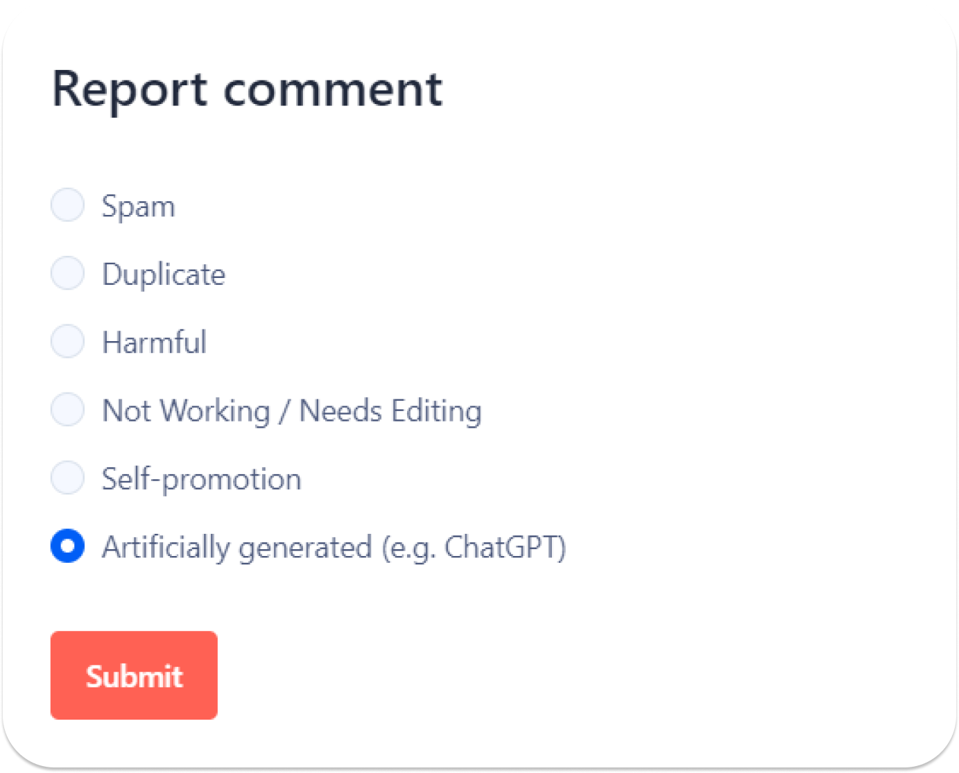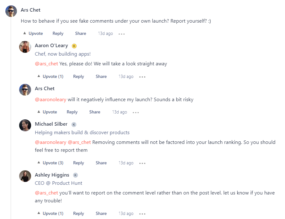 Although the community may agree that ChatGPT is a useful tool, many people take part in discussions not to share their opinion, but merely to engage for the sake of engagement. To save time, some use ChatGPT to generate responses and publish them on Product Hunt. Product Hunt is starting to combat AI-generated comments and content — for example, the "Report" button now has the option to flag AI contributions.