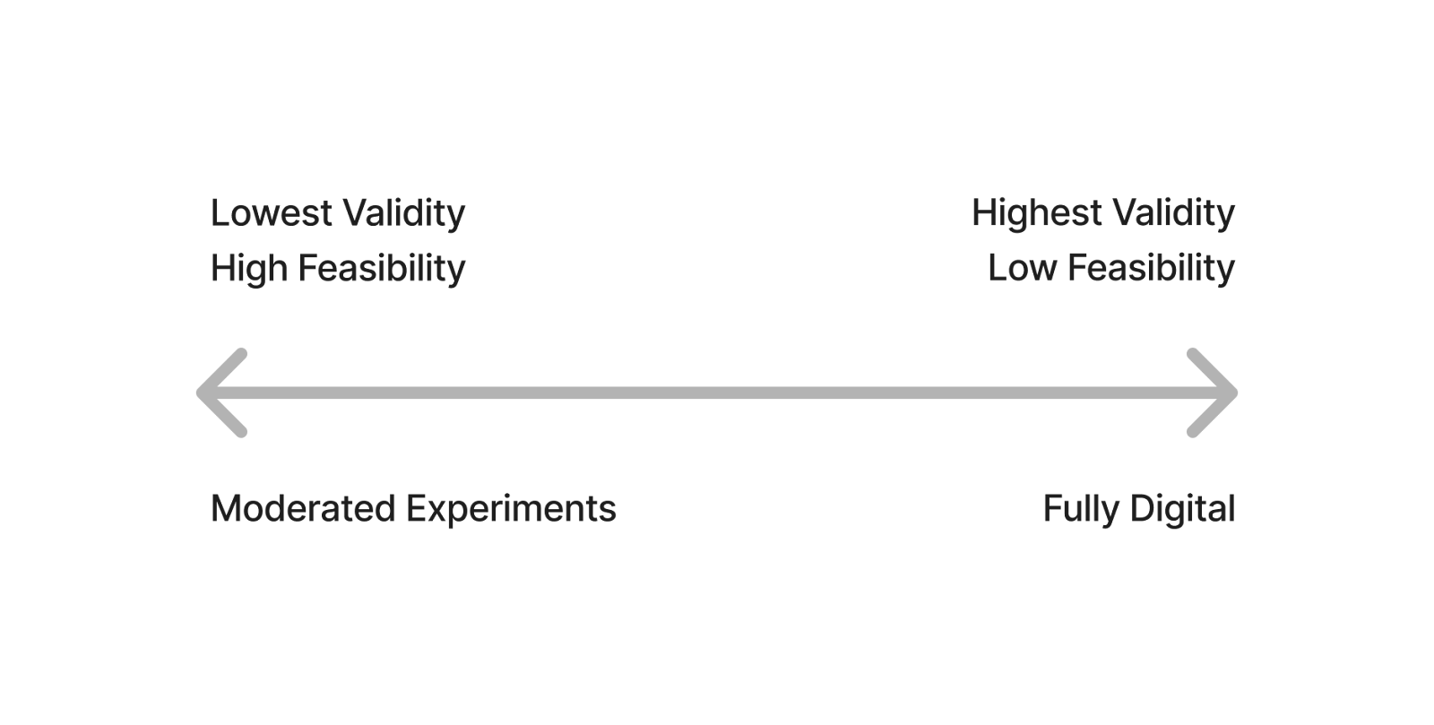 Experiments can be viewed on a spectrum ranging from high-fidelity, resource-intensive setups to simpler, more accessible methods. At one end of the spectrum lies the ideal experiment, characterized by fully digital execution, comprehensive data collection, and advanced analytics capabilities. These experiments provide the most reliable and actionable insights but require significant resources and infrastructure. In the middle of the spectrum are fully retro experiments, which utilize existing behavioral data to draw insights without the need for real-time data collection. This method strikes a balance between fidelity and feasibility, leveraging robust data infrastructure while minimizing the need for new data collection efforts. On the other end of the spectrum are basic moderated experiments, which are the most accessible and least resource-intensive. These involve direct interaction with participants in a live setting, providing valuable insights, albeit with a limited sample size, with minimal technological requirements. Understanding this spectrum allows teams to choose the experimental approach that best fits their resources and objectives. Further details on these experiment types include: