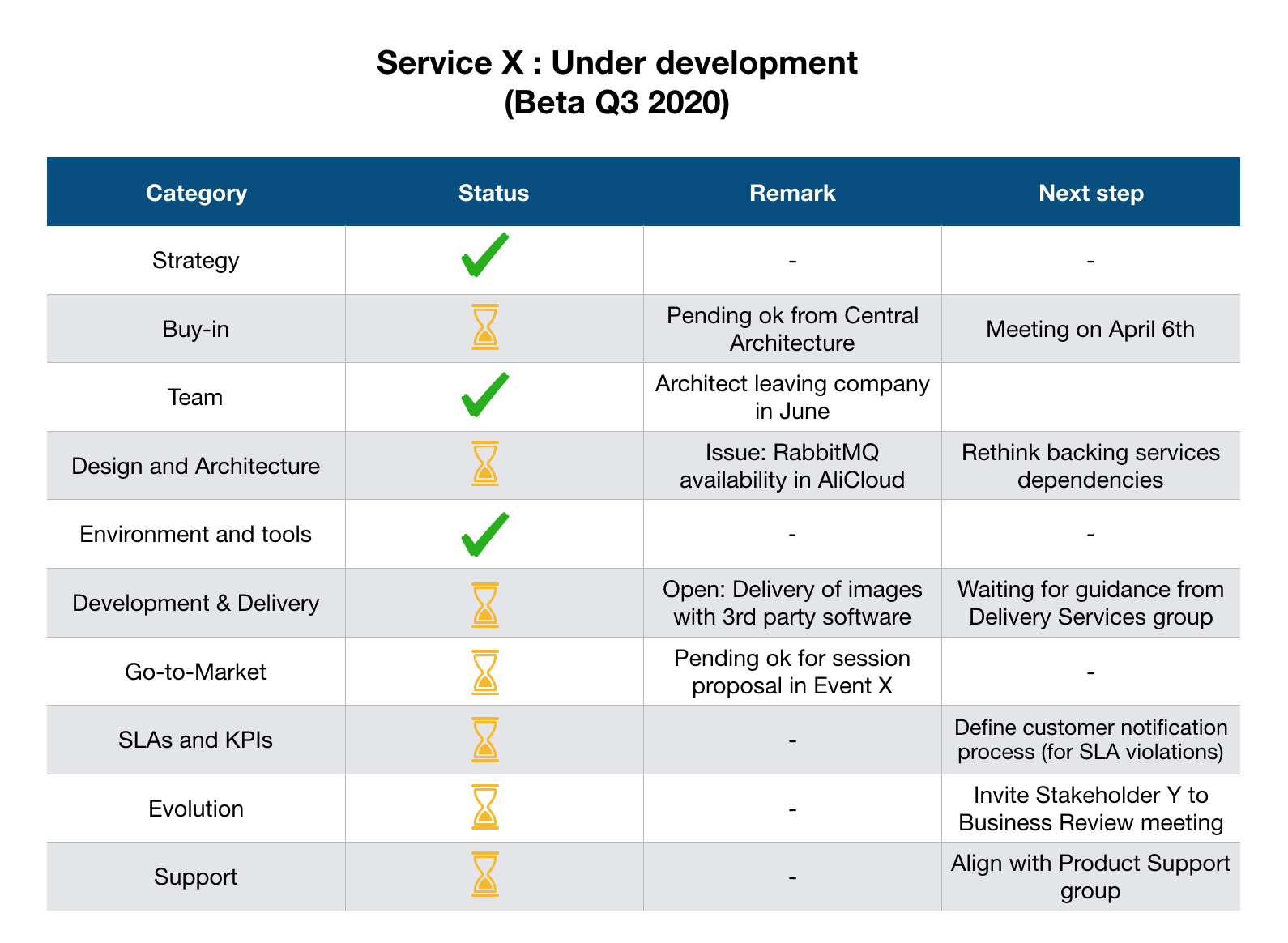 I also used it to conduct business reviews of the services in my area. Each review was structured along these categories, and the teams came up with a summary (for the service they were building) of each problem area. Presented this way, it was easy to see which team was getting something right and who was struggling with a problem area. The resulting transparency across the teams created many opportunities to learn from one another.