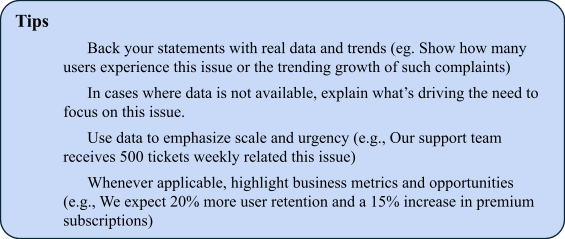 - People are motivated by impact. As the story builds up, we need to demonstrate why the problem is important to solve. We want to show the magnitude of the problem