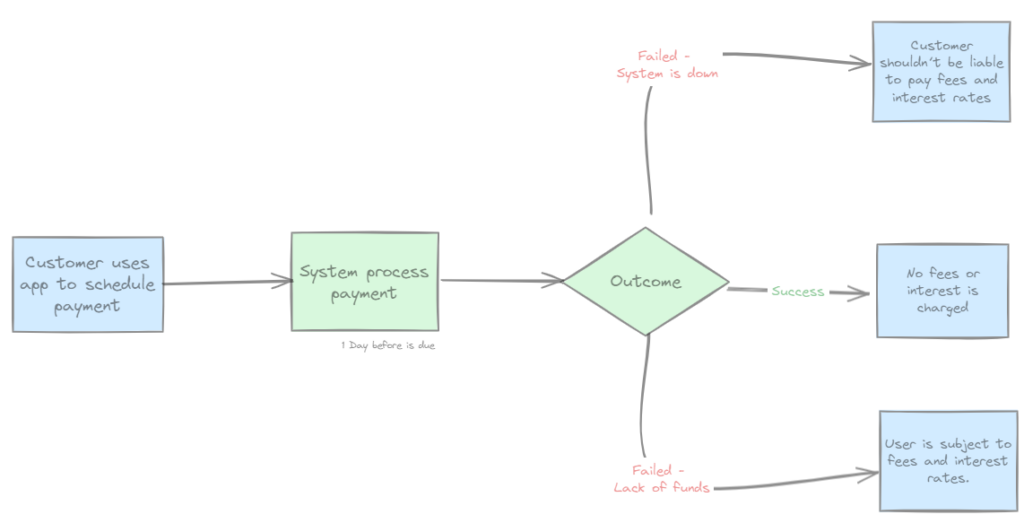 | P1 | User scheduled payment for 1 day before payment is due. System failed to process payment. Customer shouldn’t be liable to pay fees and interest. |