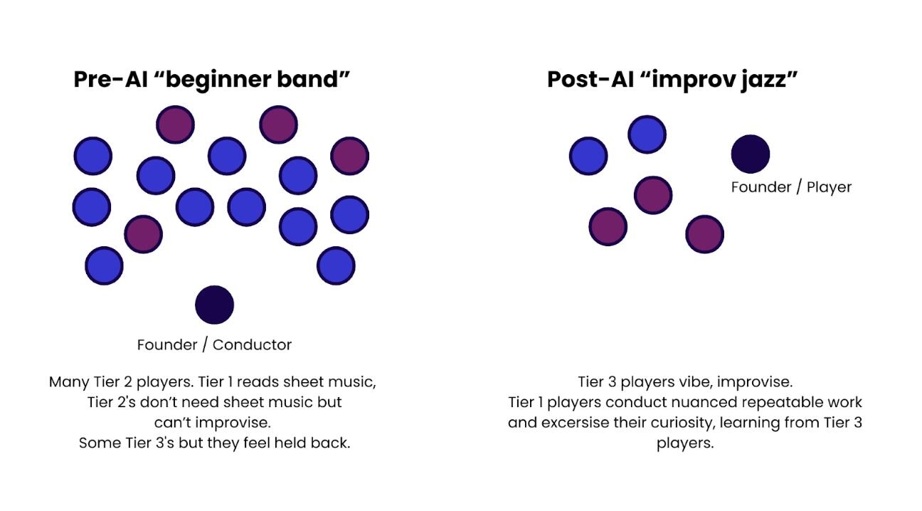 Most org charts are built around the wrong musicians. They over-index on Tier 2—the seasoned players who can perform a set without sheet music but freeze when the band modulates on the fly. In an AI era that collapses handoffs and deletes admin, Tier 2 becomes the danger zone: experienced enough to defend the old charts, not fluent enough to improvise the new ones.