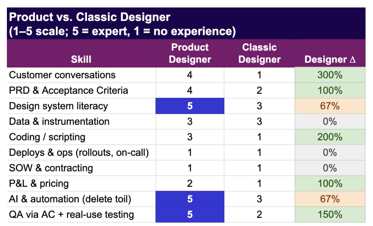 Below are tables showing the skill requirement shifts of three “roles” in our new product operating model. As you can see, we’ve heavily put a focus on breadth of skill as opposed to specialty (everyone kicks the ball).