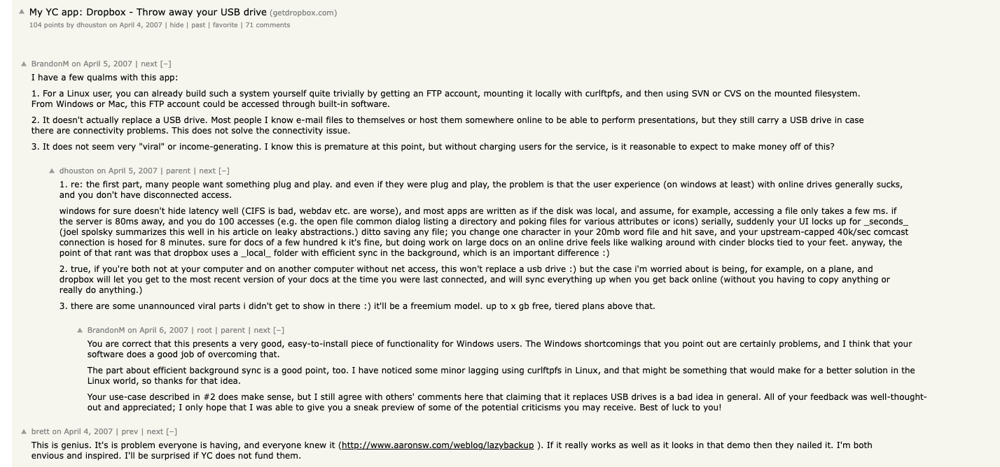 When Drew Houston came up with the idea of Dropbox back in 2007, there were already a plethora of cloud storage companies such as Microsoft, Google etc. Dropbox had severe competition, most of which have since shut down or have had minimal success. Dropbox, however, currently has 500 million users and more than a billion dollars in annual revenue. Drew created a simple video, demoing the product, and published it in April 2007 on Hacker News (a website, built by YC co-founder and run by YC) with the title "My YC app: Dropbox – Throw away your USB drive." – That’s how they got their first 1000 and then 10,000 customers!