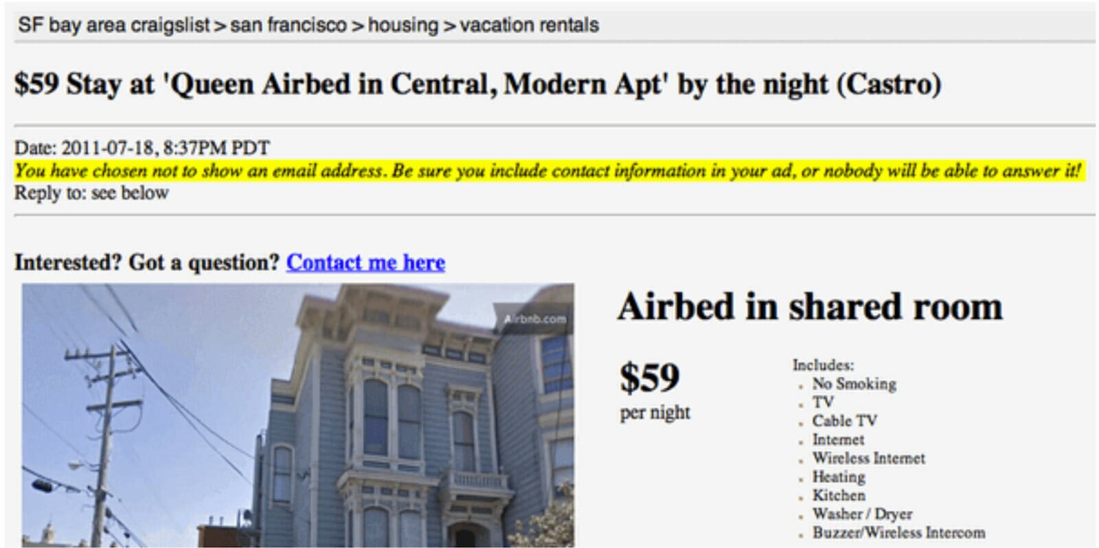 My favorite example is how Airbnb leveraged Craigslist to drive traffic and listings on their own site. Every time a listing was made in their area on Craigslist, they would email the home owner and ask if they would like to list on Airbnb. The homeowner would then spread the word about this new booking platform. Once finding success with manual outreach, they created a script that automatically emailed all new listings from Craigslist, letting people know about Airbnb. It sounds like an incredible amount of technical work – but again, it's really just leveraging what worked manually while still proving its efficacy before scaling it up. Since then, Craigslist continued refining and iterating its website and the user interface; adding new features; getting international distribution right by going slow-and-steady where locals are happy to refer people overseas; developing additional revenue streams through partnerships – all while remaining laser-focused on customer satisfaction throughout every step of their journey.