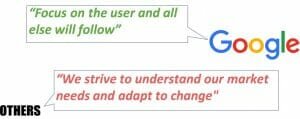 A good example of this is Google’s declaration that the user’s interest comes first. When Google builds its products it is user-centric. This means that other personas (marketers or publishers) are less important. It made a clear decision (at least declarative) to prefer the user over all others.