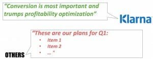 A good example of this is Klarna, a Swedish payment company. Klarna makes online shopping simple by allowing the user to buy without the use of credit/debit cards using only top of mind information (address, email, ID number etc). When Klarna builds a product or enhances an existing one everyone is aligned with its priorities and trade off (conversion vs profitability) so it is much easier and faster to make product decisions.