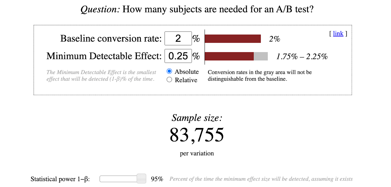 Let's use an example[c][d] to understand the minimum detectable effect better. Consider a scenario where we are managing an e-commerce website aiming to boost its conversion rates: encouraging visitors to make a purchase.