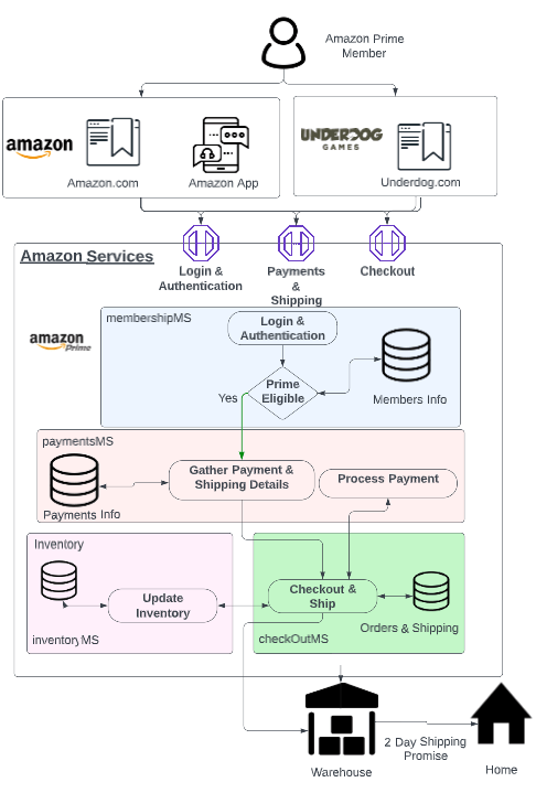 As a Prime member, the customer visits Underdog.com. He chooses an item to purchase and clicks on “Buy with Prime”. The member logs into Amazon which invokes the membership MS to authenticate the customer and confirm that he is a Prime member. Once confirmed, the member reviews and confirms the payment and shipping details and clicks on checkout. Amazon successfully orders the item and initiates two-day shipping for the chosen item.