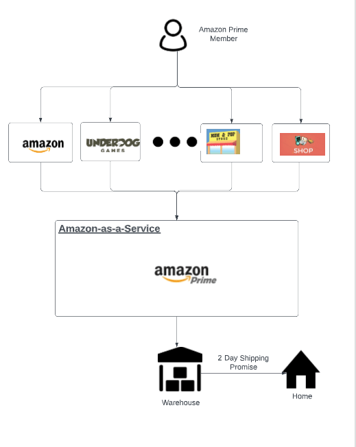 Among all the benefits of Microservices, the biggest ones are their ability to be externalizable and to enable omnichannel experience. The same Microservices can be accessed by any format of the front-end user interface, whether it be Amazon.com, Amazon's iPhone App, Android App, OR Other Online Websites and Apps that are interested in participating in this program. Below is a concept of how Amazon enabled the same Microservices architecture to enable Underdog.com to offer the "Buy with Prime" option. Watch Purpose-driven Product by Bruce Haldane.