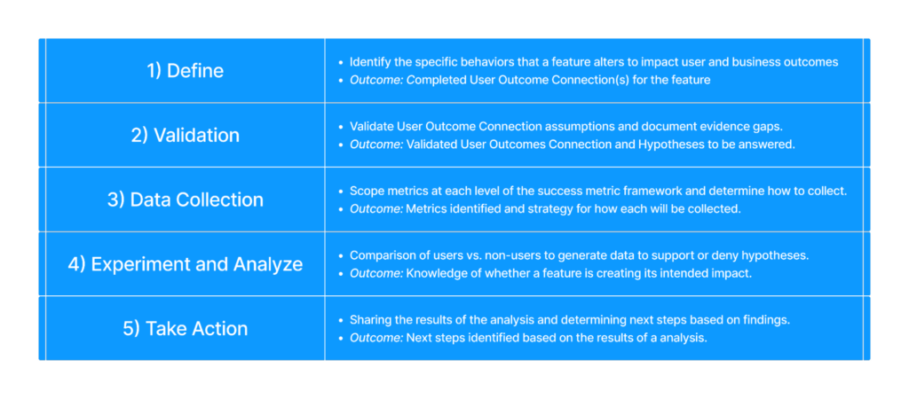 The third step, the Data Collection phase, addresses the gaps identified in the Validate step by establishing the metrics needed to measure the connections within the User Outcome Connection framework. Conducted in two parts, this starts with the functional design of the metric, determining what exactly would be needed to measure each component. The second part is actually implementing new data collection methods to capture the missing information. Here, trade-offs may be required, and teams should be comfortable with using proxy metrics if they represent an improvement over existing data. Whether it involves developing new tracking mechanisms, gathering user feedback, or setting up experiments, this step ensures that all necessary data is available for a comprehensive analysis of the feature’s impact. The metrics collected during this phase lay the groundwork for evaluating the feature’s effectiveness in the subsequent steps.