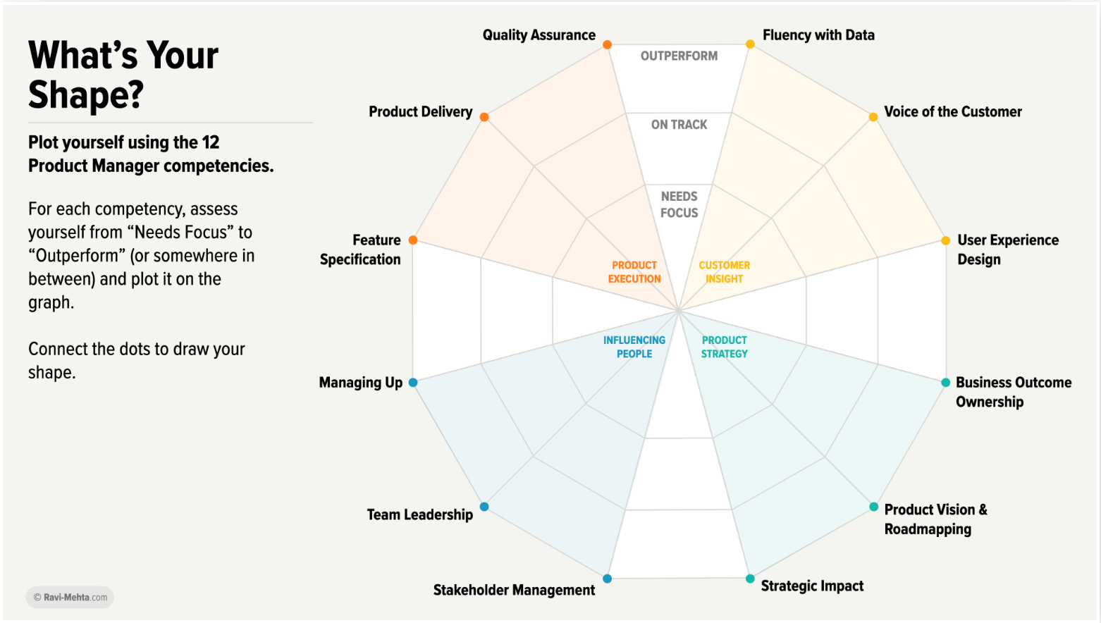 With an AI based model, there’s a lot that can be accomplished with connected systems, creating a model which becomes a template for product managers to easily learn about their career growth opportunities, track progress, aggregate data, and help them grow in their career. For example, Ravi Mehta (co-founder of Outpace, and expert of organizational learning) has defined a radar chart of various skills product managers with different experience levels need to acquire to grow into a seasoned product leader.