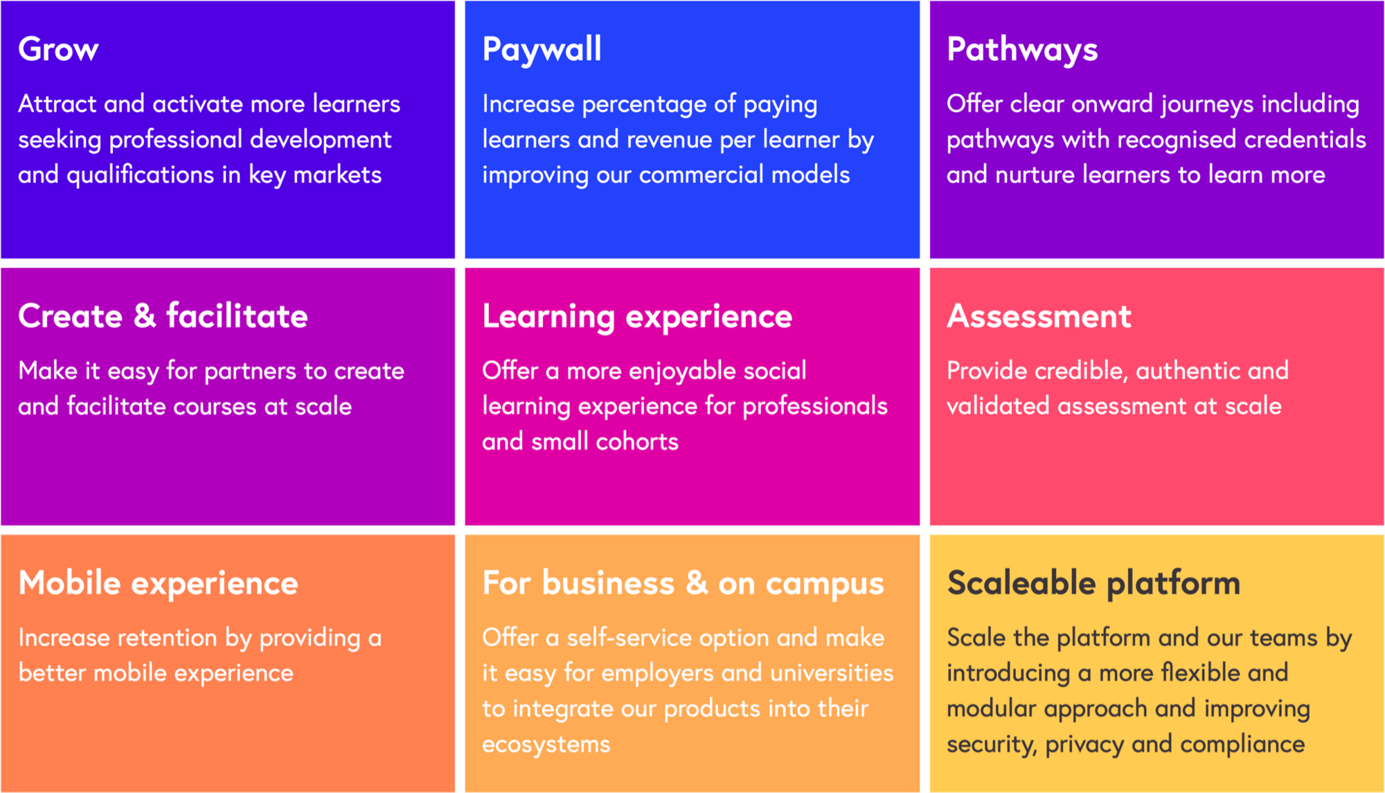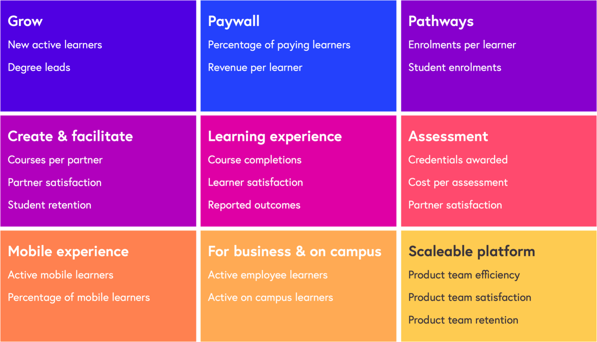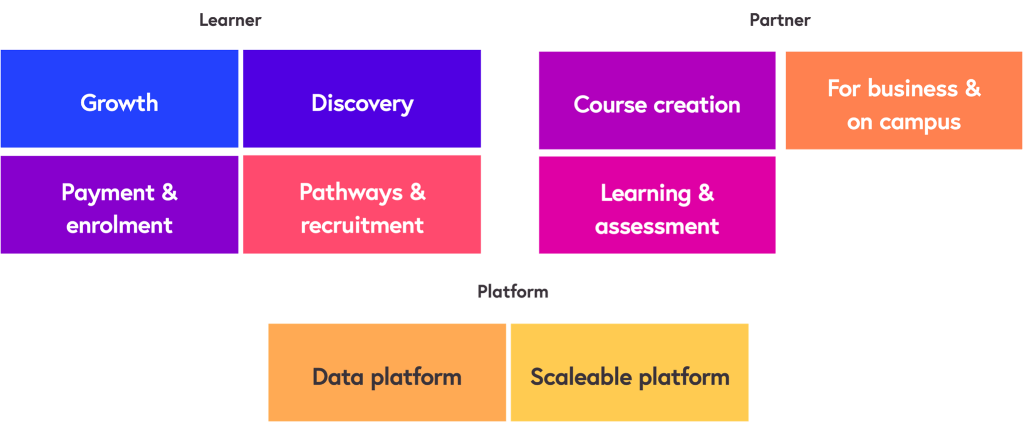 At FutureLearn, after adopting a marketplace strategy, we organised our teams into three product groups: learners, educational partners, and platform.
