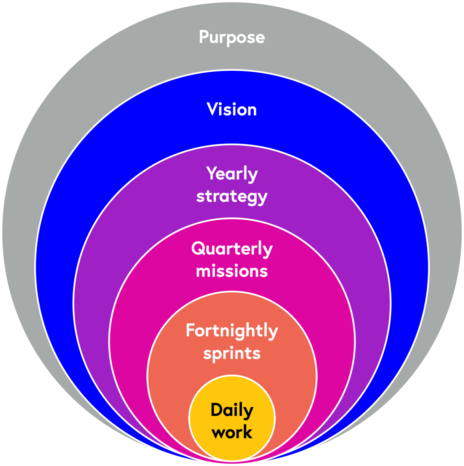 There are various ways that you can help visualise what is sometimes referred to as your agile onion—the idea that a team member can connect their daily work, to sprint goals through quarterly objectives all the way up to the strategy, vision, and purpose.