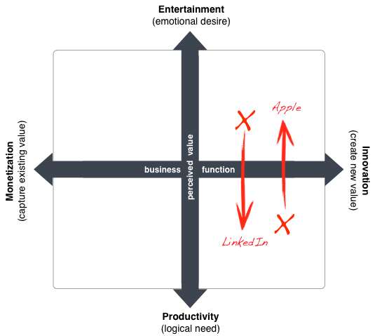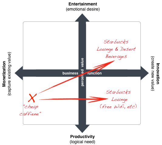In the case of Apple, they created new value around a boring commodity market for computers that focused entirely on quantifiable metrics of value such as Megabytes and CPU speed. Apple created new value atop this commodity market by taking what had been squarely in the bottom-right quadrant and shifting to the upper-right quadrant by appealing to emotion through design and user experience; something sorely lacking from the computer market until then.