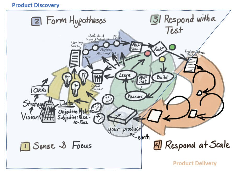 To see product discovery in the broader product development environment it helps to look at Jeff Patton’s product development cycle (Patton 2019: 9) . With the blue overlay provided, the difference between product discovery and product delivery can be made very explicit (to be very precise product vision and strategy is included in the blue overlay as well, but technically does not belong to product discovery).