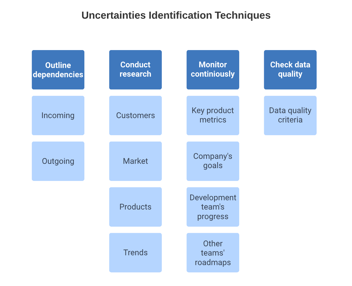 Product managers can apply the following techniques to first identify the risk areas: outline the major dependencies, conduct research, monitor continuously, and validate the data.