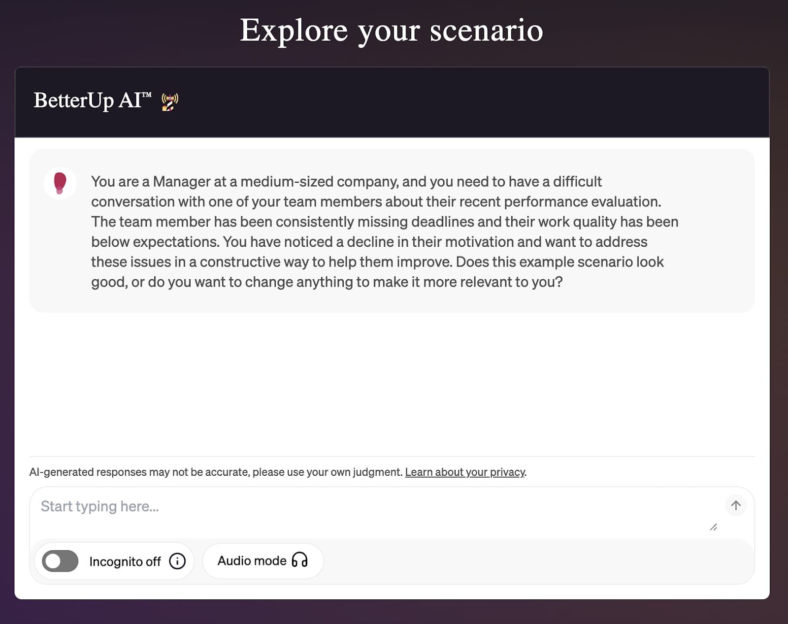 An example of a finely tuned specific chatbot is BetterUp, who has created an AI experience that can intervene with a user for a variety of situations. One of these is a role playing scenario bot intended to help the user prepare for a difficult conversation that they will be facing in their life. Given the tailored situation this bot is being deployed within, the team can create specific effectiveness measurements, such as how prepared a user feels as determined by the chat transcript and how confident they are going into their conversation.