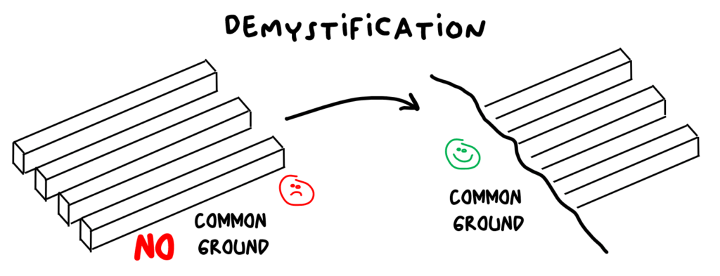 In other words, Demystification is the art of building common ground for a heterogeneous group of people. It is the difference between a complex and too detailed explanation understandable by a few, and a simplified version with key relevant details understandable by all the persons involved.