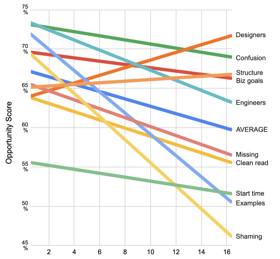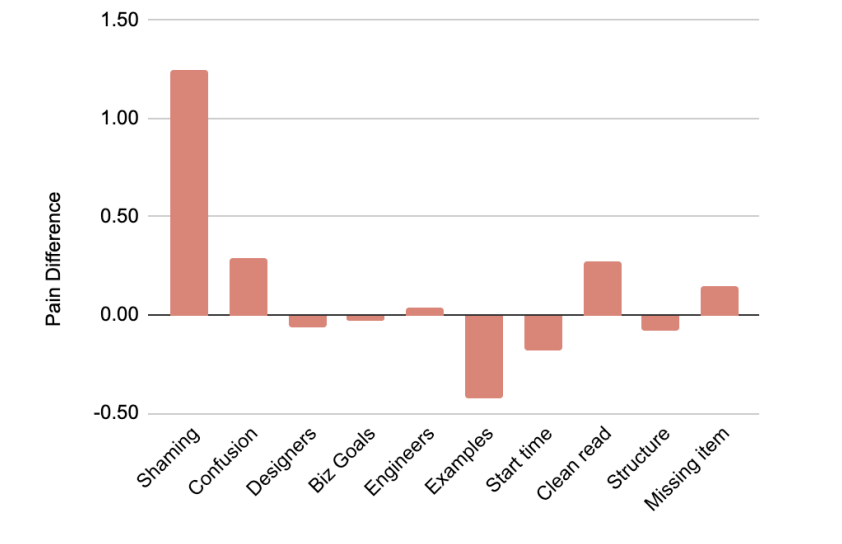 After some deeper analysis, I saw that years of product manager experience was a key predictor of pain. The chart below shows the linear trend for each pain point by years of experience. Notice Shaming (worried people say my PRD is of low quality) and Examples (help me know what ‘good’ looks like) both start high and massively decrease as years of experience increase.