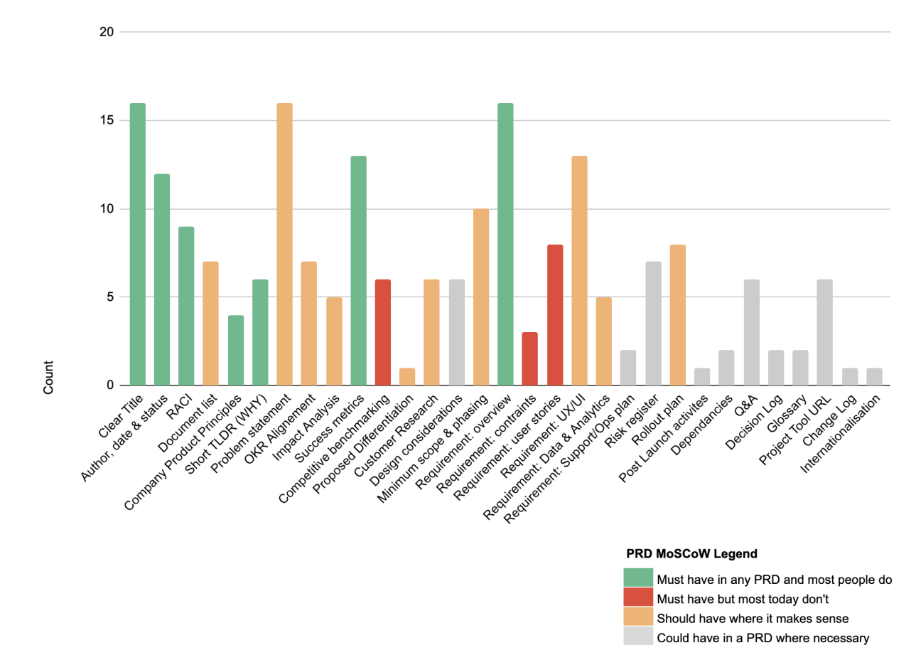 After gathering what were commonly believed to be the best PRDs across many product groups, I analyzed what information they contained to understand what made them well-liked; I then categorized them using MoSCoW: