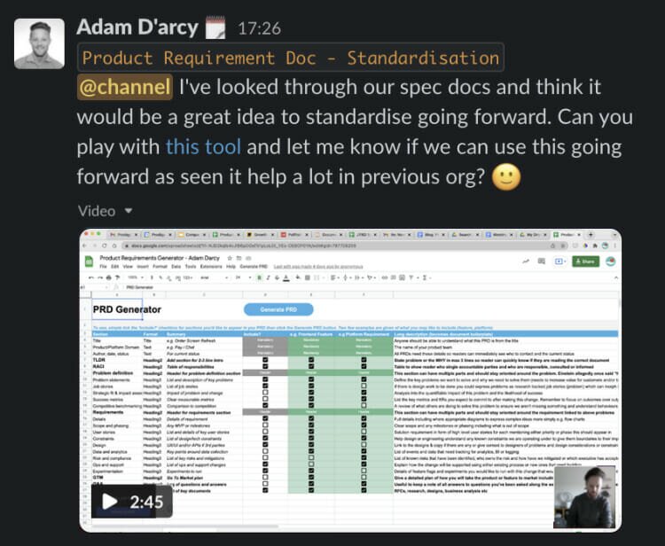 This PRD generator is now being used both inside Gojek and in my new company too. Amazingly, the effort to implement this across my current product team at Prodigy Finance and get 100% adoption consisted of me posting a three-minute Slack video showing a screen share of how to use the tool in our product channel. This suggests that the pain is much higher than the cost of the behaviour change.