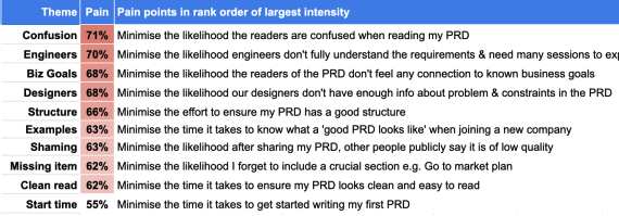 I discovered the pain points below after interviewing a few product managers in Gojek and each one became a question in the survey. After completion I then ranked in descending order of pain intensity: