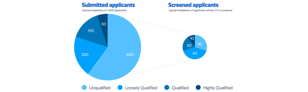 While an overabundance of candidates on the market is one factor, the barriers to discovering and applying for roles have never been lower. From Easy Apply on LinkedIn to AI-powered tools that can fill out applications for you, it’s easier than ever for candidates to apply to hundreds of roles in a short period of time. Although this is seen as a win for candidates, it contributes to the excessively high volume of applicants per role—an issue that affects candidates and employers alike. When there are hundreds to thousands of candidates for a single role, a recruiting partner or hiring manager is likely to find the 15-35 they want to conduct an initial screening call with and stop reviewing applications altogether assuming one of those shortlisted will make it through to the end and receive an offer. This leaves countless qualified candidates to receive eventual automated rejection emails, or worse, no response at all despite matching the job descriptions’ qualifications, or possibly being a better candidate than those shortlisted.