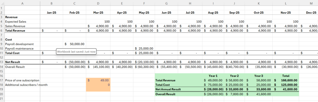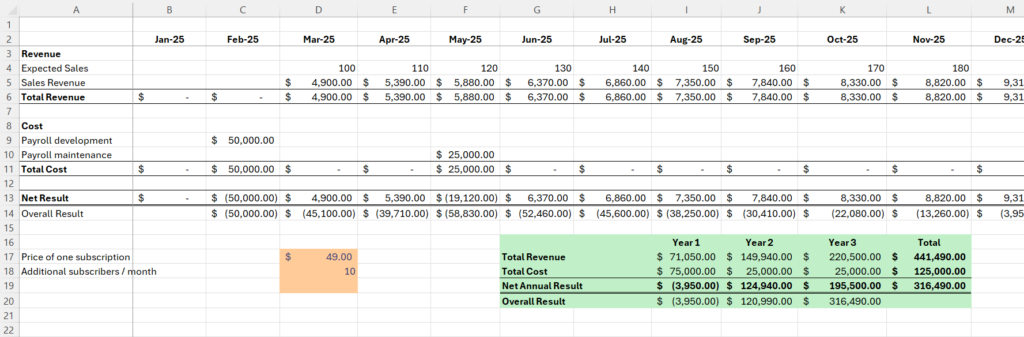 Sticking with this very basic model, you could also calculate assumptions of growth in sales, which would change these numbers quite a bit over time. With just 10 extra subscribers each subsequent month, the profit increases from USD 41k over three years to USD 316k in this model: