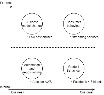 - External-Customer insight: the most notorious examples came from companies that caught a trend of new behavior. In the digital world, many times, those changes are also related to a technological change that enabled it. For example, the trends in streaming services became available by the improvement of internet bandwidth.