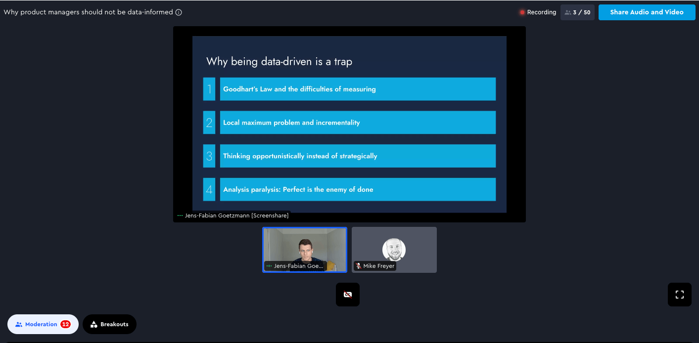 In one of the first digital breakout sessions for the day, Jens-Fabian Goetzmann Head of Product at RevenueCat explains why we should consider not being data-driven, a popular term amongst the product management community.