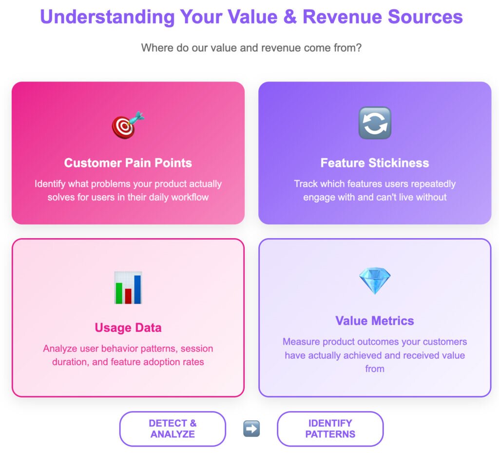 Understanding the key value drivers of your customer base requires regular communication, attunement, and genuine interest. Focus on value metrics—the product outcomes your customers have actually used—and feature stickiness.