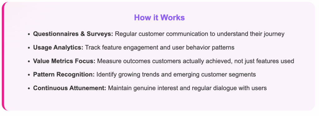 How it works: Detect what features and scenarios users implement with your product through questionnaires and usage data. Focus on value metrics (product outcomes your customer has actually used), feature stickiness. Identify growing and changing patterns, and spot emerging customer groups.