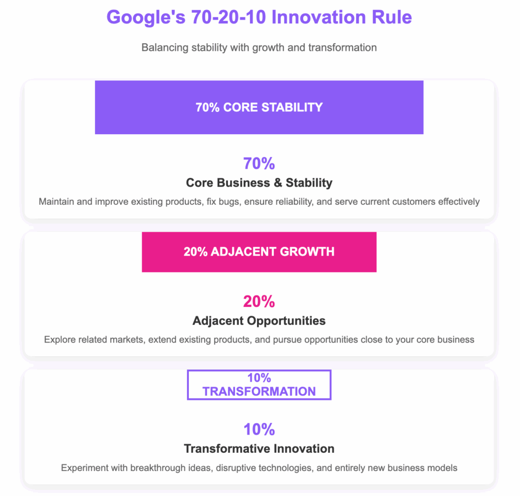 Google suggests investing 70% of effort in core stability, 20% in adjacent growth, and leaving 10% for transformative innovations. Amazon's famous "Day 1" approach splits effort between long-term innovations and agile teams focused on internal transformations and short-term fixes. For small teams, I encourage trying at least one innovation at a time to build a foundation for a growth mindset and customer curiosity.