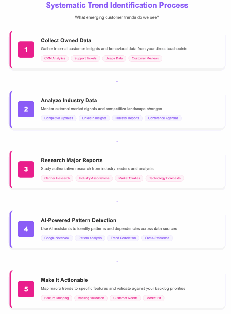 Trend identification requires a systematic approach using multiple data sources: owned data from CRM and analytics, industry data from competitors and LinkedIn client updates, major research reports from Gartner or industry associations, and conference agenda analysis to identify both evergreen and emerging pain points.