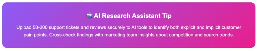 Use research AI assistants like Google Notebook to identify key patterns and dependencies in the ocean of available data. Upload your last 50-200 support tickets and reviews securely to identify explicit and implicit customer pain points, then cross-check with your marketing team regarding competition and search inquiries to estimate hidden potential.