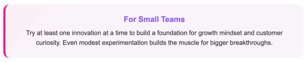 How it works: Dedicate time each month for team brainstorming. Set up small, time-boxed experiments with clear metrics. Create a culture where "failed" experiments are celebrated as learning opportunities everyone can learn from.