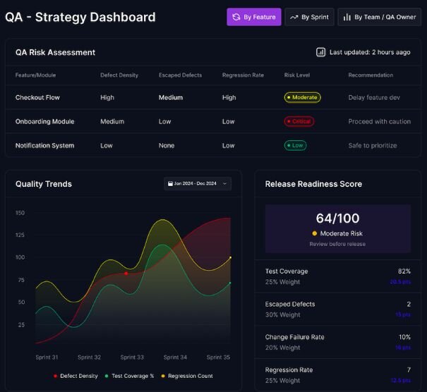 - Trendlines over time: Graphs showing how QA signals are evolving sprint over sprint. Are regressions going up? Has escaped defect volume improved after recent refactors?