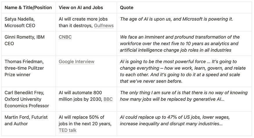 I’ve wrangled together a smorgasbord of recent quotes by influential voices on how AI might reshape the employment landscape. I urge you to delve into the linked documents or watch the attached videos yourself. This will help you shape your perspective, free from the coloring of mine.