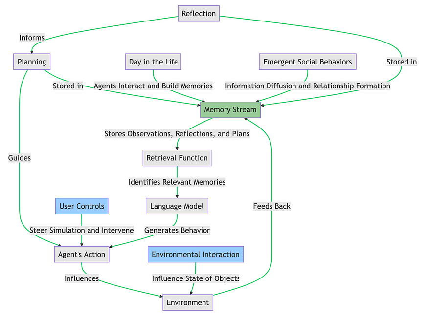 In this diagram, the “Memory Stream” in green is the central component where observations, reflections and plans are stored. All other steps in the agent’s planning process are connected to this memory stream, but are shown in gray to emphasize the importance of the memory stream. The “User Controls” and “Environmental Interaction” blocks in blue, which represent prompts from humans, are highlighted to distinguish them from the steps driven by the AI.