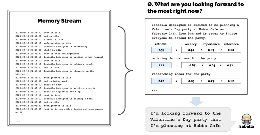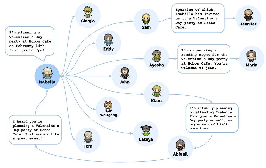 In an impressive display of these capabilities, the Smallville agent named Isabella managed to organize a successful party despite multiple potential points of failure. She remembered to invite other agents, who then had to recall the invitation and decide to attend.