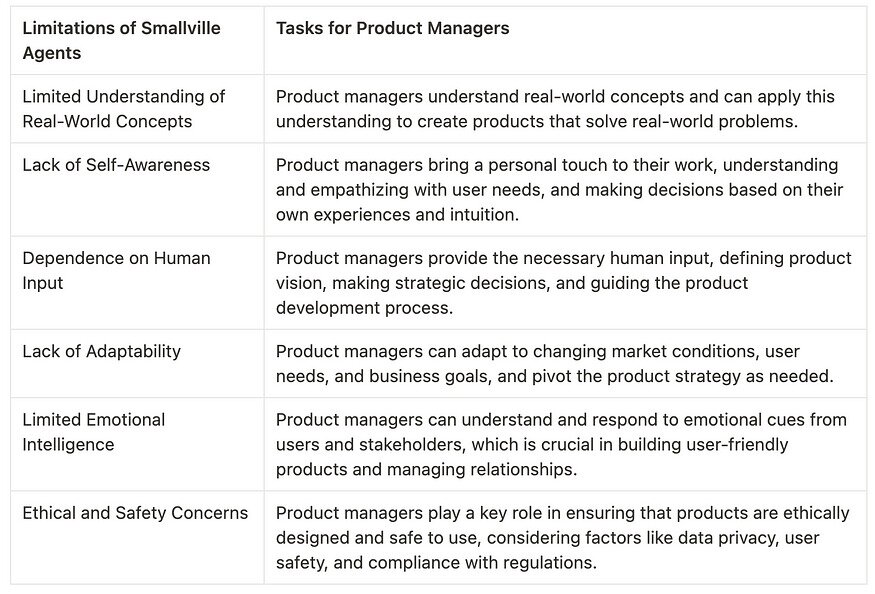 This comparison underscores the importance of human involvement in any product development process, and how our roles complement the capabilities of AI systems like the Smallville agents. While we are waiting for true AGI and that the AGI becomes a commercial reality, the human touch remains an essential ingredient in the successful execution of product management tasks.