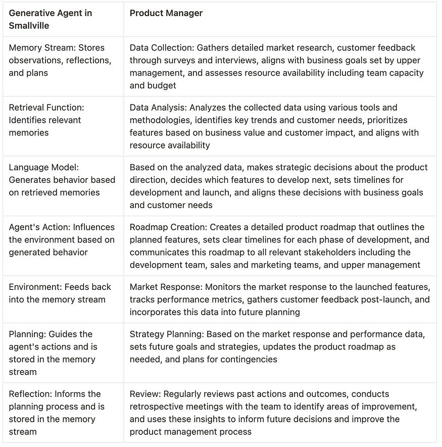 The similarity between the AI’s behavior and the tasks performed by a product manager is quite striking. Both roles involve decision-making, planning, and execution based on available information and memory. Here’s a comparative analysis to highlight the parallel workflows of Smallville’s AI agents and product managers: