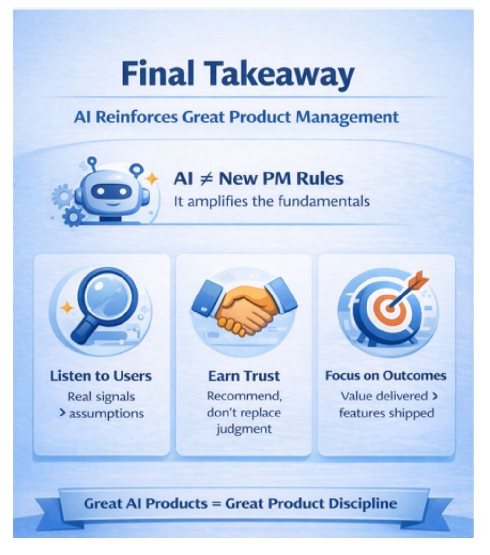 AI doesn’t change the fundamentals of Product Management—it reinforces them. The most effective AI-powered products are built by listening closely to user signals, respecting trust, and focusing relentlessly on outcomes over features.