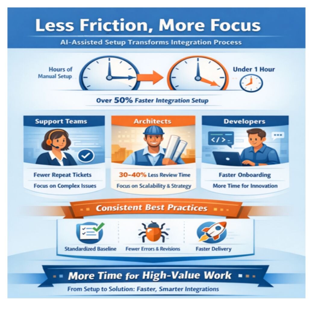 From a senior architect’s perspective, the change was equally significant. Early design reviews became shorter and more focused, with architects estimating a 30–40% reduction in time spent on foundational corrections. Because new integrations consistently started from a standardized, best-practice baseline, there was less rework during testing and fewer late-stage surprises. Architects were able to focus on higher-value concerns such as scalability, resilience, and long-term maintainability.