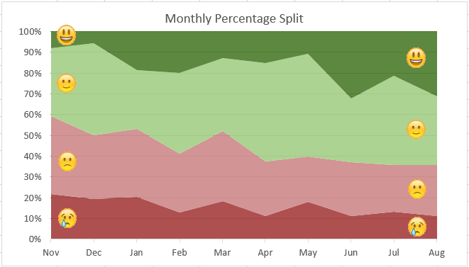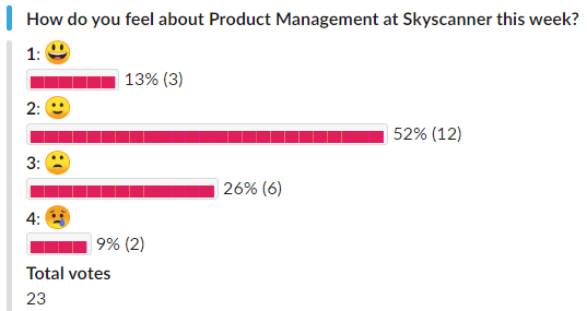 One of the ways we gauged our progress was with a simple weekly poll on Slack. Every Thursday the poll asked how people felt about product management at Skyscanner, so it was a basic way of tracking sentiment about our culture and community. It was a weak signal and by no means perfect, but it was a good enough indicator. It clearly showed big events (like a decrease in happiness after re-organisations, or an increase in happiness after product management off-sites) and, over time, showed an increasing trend towards overall happier product managers. The poll was anonymous and allowed anonymous comments to be added, and these were extremely valuable. The most pleasantly surprising effect it had was that people who were feeling down after a hard week found solace in the fact that someone else felt similarly, so it helped them to feel less alone. Eventually, we replaced it with a regular (but less frequent) psychological safety survey to get more targeted data. During our early forays into building a better culture, however, this simple sentiment tracker was very helpful.